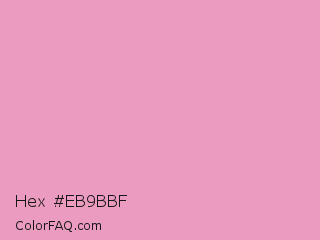 Hex #eb9bbf Color is a light rose color and the nearest color is Amaranth Pink #f19cbb. Hex code #eb9bbf and RGB value is rgb(235,155,191). In RGB color space, this color is composed of 92% red, 61% green, 75% blue, In CMYK color space, this color is composed of 0% cyan, 34% magenta, 19% yellow , 8% black , In HSL color space, this color has a hue angle of 333° , 67% saturation and 76% lightness.
