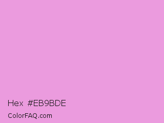 Hex #eb9bde Color is a light magenta color and the nearest color is Medium Lavender Magenta #dda0dd. Hex code #eb9bde and RGB value is rgb(235,155,222). In RGB color space, this color is composed of 92% red, 61% green, 87% blue, In CMYK color space, this color is composed of 0% cyan, 34% magenta, 6% yellow , 8% black , In HSL color space, this color has a hue angle of 310° , 67% saturation and 76% lightness.