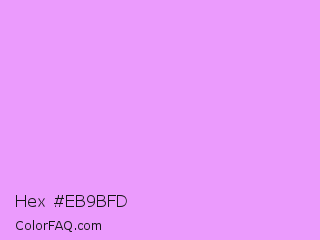 Hex #eb9bfd Color is a light purple color and the nearest color is Rich Brilliant Lavender #f1a7fe. Hex code #eb9bfd and RGB value is rgb(235,155,253). In RGB color space, this color is composed of 92% red, 61% green, 99% blue, In CMYK color space, this color is composed of 7% cyan, 39% magenta, 0% yellow , 1% black , In HSL color space, this color has a hue angle of 289° , 96% saturation and 80% lightness.
