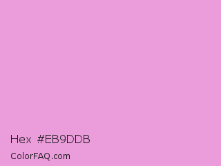 Hex #eb9ddb Color is a light magenta color and the nearest color is Light Orchid #e6a8d7. Hex code #eb9ddb and RGB value is rgb(235,157,219). In RGB color space, this color is composed of 92% red, 62% green, 86% blue, In CMYK color space, this color is composed of 0% cyan, 33% magenta, 7% yellow , 8% black , In HSL color space, this color has a hue angle of 312° , 66% saturation and 77% lightness.