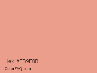 Hex #eb9e8b Color is a light red color and the nearest color is Tonys Pink #e79f8c. Hex code #eb9e8b and RGB value is rgb(235,158,139). In RGB color space, this color is composed of 92% red, 62% green, 55% blue, In CMYK color space, this color is composed of 0% cyan, 33% magenta, 41% yellow , 8% black , In HSL color space, this color has a hue angle of 12° , 71% saturation and 73% lightness.