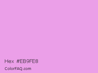 Hex #eb9fe8 Color is a light magenta color and the nearest color is Lavender Rose #fba0e3. Hex code #eb9fe8 and RGB value is rgb(235,159,232). In RGB color space, this color is composed of 92% red, 62% green, 91% blue, In CMYK color space, this color is composed of 0% cyan, 32% magenta, 1% yellow , 8% black , In HSL color space, this color has a hue angle of 302° , 66% saturation and 77% lightness.
