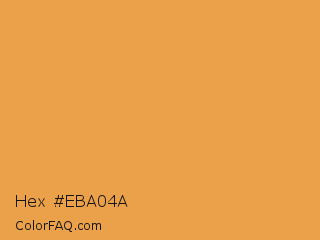 Hex #eba04a Color is a light orange color and the nearest color is Indian Yellow #e3a857. Hex code #eba04a and RGB value is rgb(235,160,74). In RGB color space, this color is composed of 92% red, 63% green, 29% blue, In CMYK color space, this color is composed of 0% cyan, 32% magenta, 69% yellow , 8% black , In HSL color space, this color has a hue angle of 32° , 80% saturation and 61% lightness.
