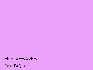 Hex #eba2fb Color is a very light purple color and the nearest color is Rich Brilliant Lavender #f1a7fe. Hex code #eba2fb and RGB value is rgb(235,162,251). In RGB color space, this color is composed of 92% red, 64% green, 98% blue, In CMYK color space, this color is composed of 6% cyan, 35% magenta, 0% yellow , 2% black , In HSL color space, this color has a hue angle of 289° , 92% saturation and 81% lightness.