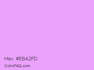 Hex #eba2fd Color is a very light purple color and the nearest color is Rich Brilliant Lavender #f1a7fe. Hex code #eba2fd and RGB value is rgb(235,162,253). In RGB color space, this color is composed of 92% red, 64% green, 99% blue, In CMYK color space, this color is composed of 7% cyan, 36% magenta, 0% yellow , 1% black , In HSL color space, this color has a hue angle of 288° , 96% saturation and 81% lightness.