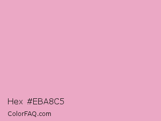 Hex #eba8c5 Color is a light rose color and the nearest color is Kobi #e79fc4. Hex code #eba8c5 and RGB value is rgb(235,168,197). In RGB color space, this color is composed of 92% red, 66% green, 77% blue, In CMYK color space, this color is composed of 0% cyan, 29% magenta, 16% yellow , 8% black , In HSL color space, this color has a hue angle of 334° , 63% saturation and 79% lightness.
