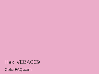 Hex #ebacc9 Color is a light rose color and the nearest color is Pink Pearl #e7accf. Hex code #ebacc9 and RGB value is rgb(235,172,201). In RGB color space, this color is composed of 92% red, 67% green, 79% blue, In CMYK color space, this color is composed of 0% cyan, 27% magenta, 14% yellow , 8% black , In HSL color space, this color has a hue angle of 332° , 61% saturation and 80% lightness.