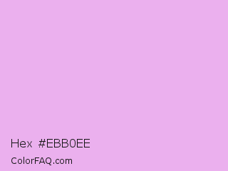 Hex #ebb0ee Color is a very light magenta color and the nearest color is Rich Brilliant Lavender #f1a7fe. Hex code #ebb0ee and RGB value is rgb(235,176,238). In RGB color space, this color is composed of 92% red, 69% green, 93% blue, In CMYK color space, this color is composed of 1% cyan, 26% magenta, 0% yellow , 7% black , In HSL color space, this color has a hue angle of 297° , 65% saturation and 81% lightness.