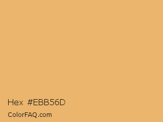 Hex #ebb56d Color is a light orange color and the nearest color is Porsche #eaae69. Hex code #ebb56d and RGB value is rgb(235,181,109). In RGB color space, this color is composed of 92% red, 71% green, 43% blue, In CMYK color space, this color is composed of 0% cyan, 23% magenta, 54% yellow , 8% black , In HSL color space, this color has a hue angle of 34° , 76% saturation and 67% lightness.