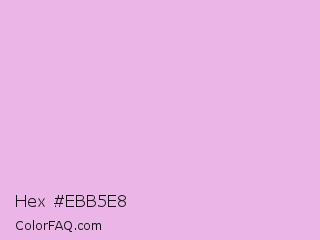Hex #ebb5e8 Color is a very light magenta color and the nearest color is French Lilac #ecc7ee. Hex code #ebb5e8 and RGB value is rgb(235,181,232). In RGB color space, this color is composed of 92% red, 71% green, 91% blue, In CMYK color space, this color is composed of 0% cyan, 23% magenta, 1% yellow , 8% black , In HSL color space, this color has a hue angle of 303° , 57% saturation and 82% lightness.