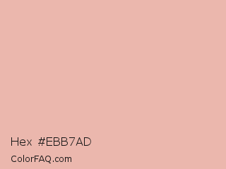 Hex #ebb7ad Color is a light red color and the nearest color is Shilo #e8b9b3. Hex code #ebb7ad and RGB value is rgb(235,183,173). In RGB color space, this color is composed of 92% red, 72% green, 68% blue, In CMYK color space, this color is composed of 0% cyan, 22% magenta, 26% yellow , 8% black , In HSL color space, this color has a hue angle of 10° , 61% saturation and 80% lightness.