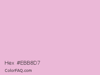 Hex #ebb8d7 Color is a very light magenta color and the nearest color is Cameo Pink #efbbcc. Hex code #ebb8d7 and RGB value is rgb(235,184,215). In RGB color space, this color is composed of 92% red, 72% green, 84% blue, In CMYK color space, this color is composed of 0% cyan, 22% magenta, 9% yellow , 8% black , In HSL color space, this color has a hue angle of 324° , 56% saturation and 82% lightness.