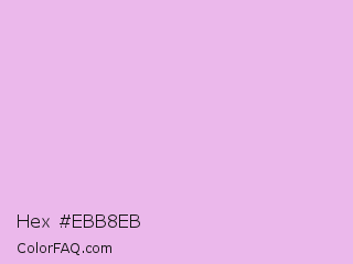 Hex #ebb8eb Color is a very light magenta color and the nearest color is French Lilac #ecc7ee. Hex code #ebb8eb and RGB value is rgb(235,184,235). In RGB color space, this color is composed of 92% red, 72% green, 92% blue, In CMYK color space, this color is composed of 0% cyan, 22% magenta, 0% yellow , 8% black , In HSL color space, this color has a hue angle of 300° , 56% saturation and 82% lightness.
