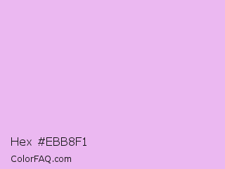 Hex #ebb8f1 Color is a very light magenta color and the nearest color is French Lilac #ecc7ee. Hex code #ebb8f1 and RGB value is rgb(235,184,241). In RGB color space, this color is composed of 92% red, 72% green, 95% blue, In CMYK color space, this color is composed of 2% cyan, 24% magenta, 0% yellow , 5% black , In HSL color space, this color has a hue angle of 294° , 67% saturation and 83% lightness.