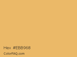 Hex #ebb968 Color is a light orange color and the nearest color is Porsche #eaae69. Hex code #ebb968 and RGB value is rgb(235,185,104). In RGB color space, this color is composed of 92% red, 73% green, 41% blue, In CMYK color space, this color is composed of 0% cyan, 21% magenta, 56% yellow , 8% black , In HSL color space, this color has a hue angle of 37° , 77% saturation and 66% lightness.