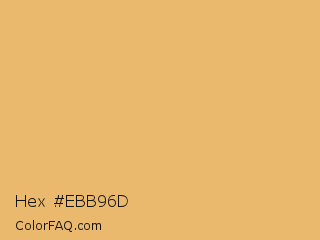 Hex #ebb96d Color is a light orange color and the nearest color is Porsche #eaae69. Hex code #ebb96d and RGB value is rgb(235,185,109). In RGB color space, this color is composed of 92% red, 73% green, 43% blue, In CMYK color space, this color is composed of 0% cyan, 21% magenta, 54% yellow , 8% black , In HSL color space, this color has a hue angle of 36° , 76% saturation and 67% lightness.