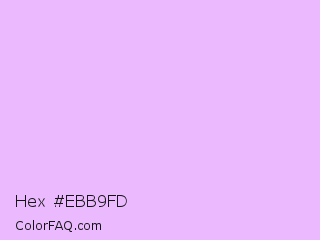 Hex #ebb9fd Color is a very light purple color and the nearest color is Electric Lavender #f4bbff. Hex code #ebb9fd and RGB value is rgb(235,185,253). In RGB color space, this color is composed of 92% red, 73% green, 99% blue, In CMYK color space, this color is composed of 7% cyan, 27% magenta, 0% yellow , 1% black , In HSL color space, this color has a hue angle of 284° , 94% saturation and 86% lightness.