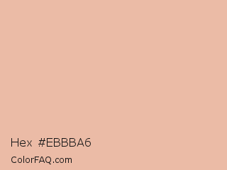 Hex #ebbba6 Color is a light orange color and the nearest color is Cashmere #e6bea5. Hex code #ebbba6 and RGB value is rgb(235,187,166). In RGB color space, this color is composed of 92% red, 73% green, 65% blue, In CMYK color space, this color is composed of 0% cyan, 20% magenta, 29% yellow , 8% black , In HSL color space, this color has a hue angle of 18° , 63% saturation and 79% lightness.