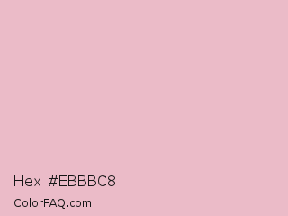Hex #ebbbc8 Color is a very light rose color and the nearest color is Cameo Pink #efbbcc. Hex code #ebbbc8 and RGB value is rgb(235,187,200). In RGB color space, this color is composed of 92% red, 73% green, 78% blue, In CMYK color space, this color is composed of 0% cyan, 20% magenta, 15% yellow , 8% black , In HSL color space, this color has a hue angle of 344° , 55% saturation and 83% lightness.
