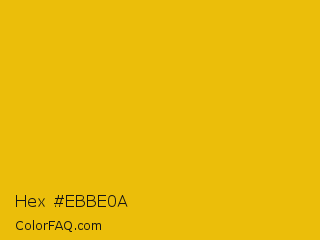 Hex #ebbe0a Color is a normal yellow color and the nearest color is Corn #e7bf05. Hex code #ebbe0a and RGB value is rgb(235,190,10). In RGB color space, this color is composed of 92% red, 75% green, 4% blue, In CMYK color space, this color is composed of 0% cyan, 19% magenta, 96% yellow , 8% black , In HSL color space, this color has a hue angle of 48° , 92% saturation and 48% lightness.