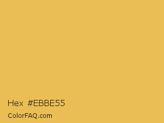 Hex #ebbe55 Color is a light orange color and the nearest color is Ronchi #ecc54e. Hex code #ebbe55 and RGB value is rgb(235,190,85). In RGB color space, this color is composed of 92% red, 75% green, 33% blue, In CMYK color space, this color is composed of 0% cyan, 19% magenta, 64% yellow , 8% black , In HSL color space, this color has a hue angle of 42° , 79% saturation and 63% lightness.