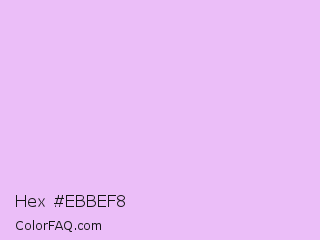 Hex #ebbef8 Color is a very light purple color and the nearest color is Electric Lavender #f4bbff. Hex code #ebbef8 and RGB value is rgb(235,190,248). In RGB color space, this color is composed of 92% red, 75% green, 97% blue, In CMYK color space, this color is composed of 5% cyan, 23% magenta, 0% yellow , 3% black , In HSL color space, this color has a hue angle of 287° , 81% saturation and 86% lightness.