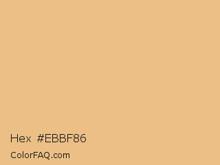 Hex #ebbf86 Color is a light orange color and the nearest color is Gold Sand #e6be8a. Hex code #ebbf86 and RGB value is rgb(235,191,134). In RGB color space, this color is composed of 92% red, 75% green, 53% blue, In CMYK color space, this color is composed of 0% cyan, 19% magenta, 43% yellow , 8% black , In HSL color space, this color has a hue angle of 34° , 72% saturation and 72% lightness.