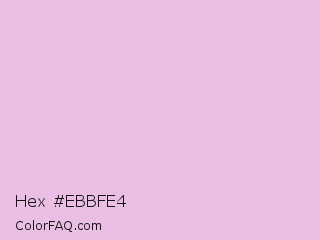 Hex #ebbfe4 Color is a very light magenta color and the nearest color is French Lilac #ecc7ee. Hex code #ebbfe4 and RGB value is rgb(235,191,228). In RGB color space, this color is composed of 92% red, 75% green, 89% blue, In CMYK color space, this color is composed of 0% cyan, 19% magenta, 3% yellow , 8% black , In HSL color space, this color has a hue angle of 310° , 52% saturation and 84% lightness.