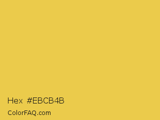 Hex #ebcb4b Color is a light yellow color and the nearest color is Ronchi #ecc54e. Hex code #ebcb4b and RGB value is rgb(235,203,75). In RGB color space, this color is composed of 92% red, 80% green, 29% blue, In CMYK color space, this color is composed of 0% cyan, 14% magenta, 68% yellow , 8% black , In HSL color space, this color has a hue angle of 48° , 80% saturation and 61% lightness.