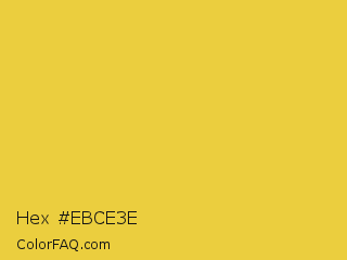 Hex #ebce3e Color is a normal yellow color and the nearest color is Sandstorm #ecd540. Hex code #ebce3e and RGB value is rgb(235,206,62). In RGB color space, this color is composed of 92% red, 81% green, 24% blue, In CMYK color space, this color is composed of 0% cyan, 12% magenta, 74% yellow , 8% black , In HSL color space, this color has a hue angle of 50° , 81% saturation and 58% lightness.