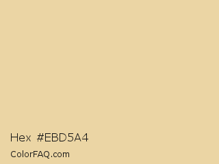 Hex #ebd5a4 Color is a light orange color and the nearest color is New Orleans #f3d69d. Hex code #ebd5a4 and RGB value is rgb(235,213,164). In RGB color space, this color is composed of 92% red, 84% green, 64% blue, In CMYK color space, this color is composed of 0% cyan, 9% magenta, 30% yellow , 8% black , In HSL color space, this color has a hue angle of 41° , 64% saturation and 78% lightness.