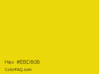 Hex #ebd80b Color is a normal yellow color and the nearest color is Citrine #e4d00a. Hex code #ebd80b and RGB value is rgb(235,216,11). In RGB color space, this color is composed of 92% red, 85% green, 4% blue, In CMYK color space, this color is composed of 0% cyan, 8% magenta, 95% yellow , 8% black , In HSL color space, this color has a hue angle of 55° , 91% saturation and 48% lightness.