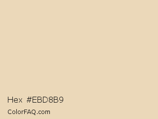 Hex #ebd8b9 Color is a very light orange color and the nearest color is Raffia #eadab8. Hex code #ebd8b9 and RGB value is rgb(235,216,185). In RGB color space, this color is composed of 92% red, 85% green, 73% blue, In CMYK color space, this color is composed of 0% cyan, 8% magenta, 21% yellow , 8% black , In HSL color space, this color has a hue angle of 37° , 56% saturation and 82% lightness.