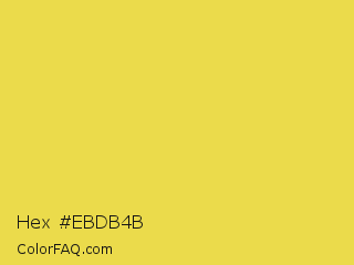 Hex #ebdb4b Color is a light yellow color and the nearest color is Minion Yellow #f5e050. Hex code #ebdb4b and RGB value is rgb(235,219,75). In RGB color space, this color is composed of 92% red, 86% green, 29% blue, In CMYK color space, this color is composed of 0% cyan, 7% magenta, 68% yellow , 8% black , In HSL color space, this color has a hue angle of 54° , 80% saturation and 61% lightness.