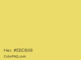 Hex #ebdb68 Color is a light yellow color and the nearest color is Hansa Yellow #e9d66b. Hex code #ebdb68 and RGB value is rgb(235,219,104). In RGB color space, this color is composed of 92% red, 86% green, 41% blue, In CMYK color space, this color is composed of 0% cyan, 7% magenta, 56% yellow , 8% black , In HSL color space, this color has a hue angle of 53° , 77% saturation and 66% lightness.