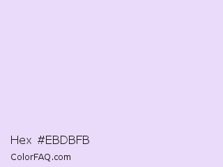 Hex #ebdbfb Color is a very light violet color and the nearest color is Lavender Mist #e6e6fa. Hex code #ebdbfb and RGB value is rgb(235,219,251). In RGB color space, this color is composed of 92% red, 86% green, 98% blue, In CMYK color space, this color is composed of 6% cyan, 13% magenta, 0% yellow , 2% black , In HSL color space, this color has a hue angle of 270° , 80% saturation and 92% lightness.