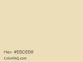 Hex #ebdeb8 Color is a very light orange color and the nearest color is Raffia #eadab8. Hex code #ebdeb8 and RGB value is rgb(235,222,184). In RGB color space, this color is composed of 92% red, 87% green, 72% blue, In CMYK color space, this color is composed of 0% cyan, 6% magenta, 22% yellow , 8% black , In HSL color space, this color has a hue angle of 45° , 56% saturation and 82% lightness.
