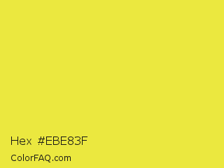 Hex #ebe83f Color is a normal yellow color and the nearest color is Starship #ecf245. Hex code #ebe83f and RGB value is rgb(235,232,63). In RGB color space, this color is composed of 92% red, 91% green, 25% blue, In CMYK color space, this color is composed of 0% cyan, 1% magenta, 73% yellow , 8% black , In HSL color space, this color has a hue angle of 59° , 81% saturation and 58% lightness.
