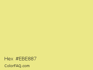 Hex #ebe887 Color is a light yellow color and the nearest color is Sahara Sand #f1e788. Hex code #ebe887 and RGB value is rgb(235,232,135). In RGB color space, this color is composed of 92% red, 91% green, 53% blue, In CMYK color space, this color is composed of 0% cyan, 1% magenta, 43% yellow , 8% black , In HSL color space, this color has a hue angle of 58° , 71% saturation and 73% lightness.