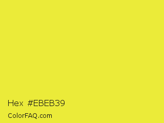 Hex #ebeb39 Color is a normal yellow color and the nearest color is Starship #ecf245. Hex code #ebeb39 and RGB value is rgb(235,235,57). In RGB color space, this color is composed of 92% red, 92% green, 22% blue, In CMYK color space, this color is composed of 0% cyan, 0% magenta, 76% yellow , 8% black , In HSL color space, this color has a hue angle of 60° , 82% saturation and 57% lightness.