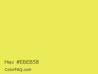 Hex #ebeb58 Color is a light yellow color and the nearest color is Candy Corn #fbec5d. Hex code #ebeb58 and RGB value is rgb(235,235,88). In RGB color space, this color is composed of 92% red, 92% green, 35% blue, In CMYK color space, this color is composed of 0% cyan, 0% magenta, 63% yellow , 8% black , In HSL color space, this color has a hue angle of 60° , 79% saturation and 63% lightness.