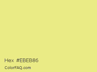 Hex #ebeb86 Color is a light yellow color and the nearest color is Sahara Sand #f1e788. Hex code #ebeb86 and RGB value is rgb(235,235,134). In RGB color space, this color is composed of 92% red, 92% green, 53% blue, In CMYK color space, this color is composed of 0% cyan, 0% magenta, 43% yellow , 8% black , In HSL color space, this color has a hue angle of 60° , 72% saturation and 72% lightness.