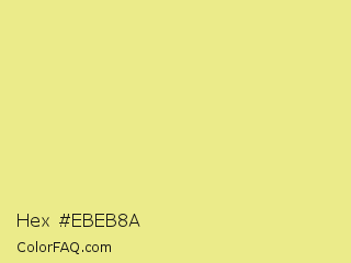 Hex #ebeb8a Color is a light yellow color and the nearest color is Khaki #f0e68c. Hex code #ebeb8a and RGB value is rgb(235,235,138). In RGB color space, this color is composed of 92% red, 92% green, 54% blue, In CMYK color space, this color is composed of 0% cyan, 0% magenta, 41% yellow , 8% black , In HSL color space, this color has a hue angle of 60° , 71% saturation and 73% lightness.