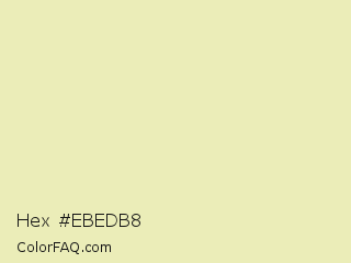 Hex #ebedb8 Color is a very light yellow color and the nearest color is Fall Green #ecebbd. Hex code #ebedb8 and RGB value is rgb(235,237,184). In RGB color space, this color is composed of 92% red, 93% green, 72% blue, In CMYK color space, this color is composed of 1% cyan, 0% magenta, 22% yellow , 7% black , In HSL color space, this color has a hue angle of 62° , 60% saturation and 83% lightness.