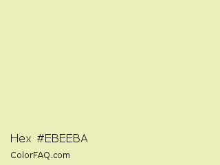Hex #ebeeba Color is a very light yellow color and the nearest color is Fall Green #ecebbd. Hex code #ebeeba and RGB value is rgb(235,238,186). In RGB color space, this color is composed of 92% red, 93% green, 73% blue, In CMYK color space, this color is composed of 1% cyan, 0% magenta, 22% yellow , 7% black , In HSL color space, this color has a hue angle of 63° , 60% saturation and 83% lightness.