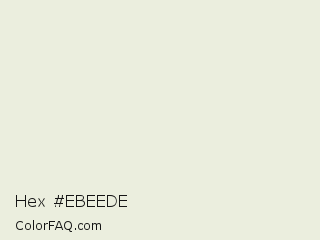 Hex #ebeede Color is a very light lime color and the nearest color is Green White #e8ebe0. Hex code #ebeede and RGB value is rgb(235,238,222). In RGB color space, this color is composed of 92% red, 93% green, 87% blue, In CMYK color space, this color is composed of 1% cyan, 0% magenta, 7% yellow , 7% black , In HSL color space, this color has a hue angle of 71° , 32% saturation and 90% lightness.