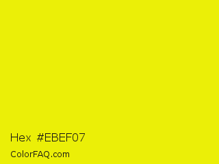 Hex #ebef07 Color is a normal yellow color and the nearest color is Titanium Yellow #eee600. Hex code #ebef07 and RGB value is rgb(235,239,7). In RGB color space, this color is composed of 92% red, 94% green, 3% blue, In CMYK color space, this color is composed of 2% cyan, 0% magenta, 97% yellow , 6% black , In HSL color space, this color has a hue angle of 61° , 94% saturation and 48% lightness.