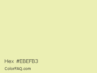 Hex #ebefb3 Color is a very light yellow color and the nearest color is Fall Green #ecebbd. Hex code #ebefb3 and RGB value is rgb(235,239,179). In RGB color space, this color is composed of 92% red, 94% green, 70% blue, In CMYK color space, this color is composed of 2% cyan, 0% magenta, 25% yellow , 6% black , In HSL color space, this color has a hue angle of 64° , 65% saturation and 82% lightness.