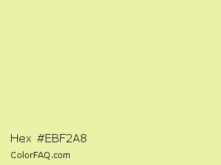 Hex #ebf2a8 Color is a light yellow color and the nearest color is Pale Goldenrod #eee8aa. Hex code #ebf2a8 and RGB value is rgb(235,242,168). In RGB color space, this color is composed of 92% red, 95% green, 66% blue, In CMYK color space, this color is composed of 3% cyan, 0% magenta, 31% yellow , 5% black , In HSL color space, this color has a hue angle of 66° , 74% saturation and 80% lightness.