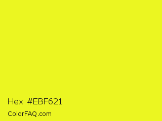 Hex #ebf621 Color is a normal yellow color and the nearest color is Piss Yellow #e1e115. Hex code #ebf621 and RGB value is rgb(235,246,33). In RGB color space, this color is composed of 92% red, 96% green, 13% blue, In CMYK color space, this color is composed of 4% cyan, 0% magenta, 87% yellow , 4% black , In HSL color space, this color has a hue angle of 63° , 92% saturation and 55% lightness.